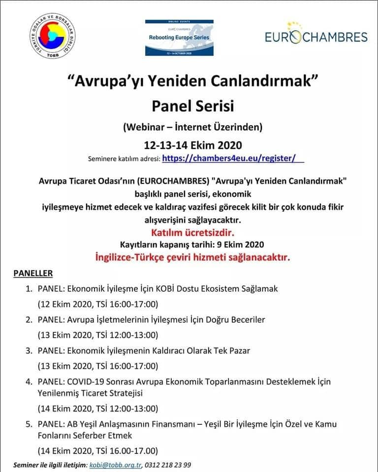?EUROCHAMBRES “Avrupa’yı Yeniden Canlandırmak” başlıklı Panel Serisi (Webinar – İnternet Üzerinden) ?12-13-14 Ekim 2020