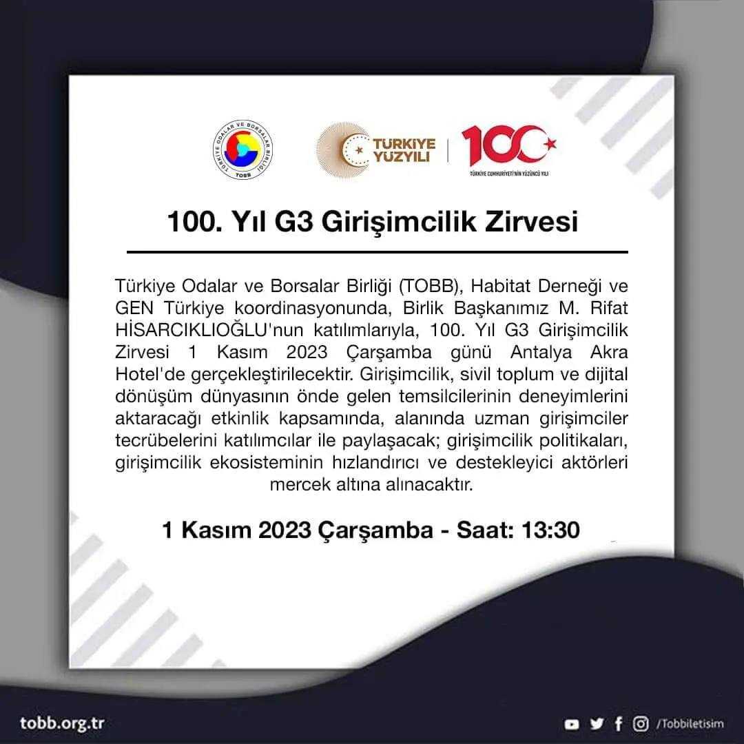 100. Yıl G3 Girişimcilik ZirvesiAntalya Akra Hotel 1 Kasım ÇarşambaKatılım Linki Meeting Mentorlar Oturumuna Başvuru Linki