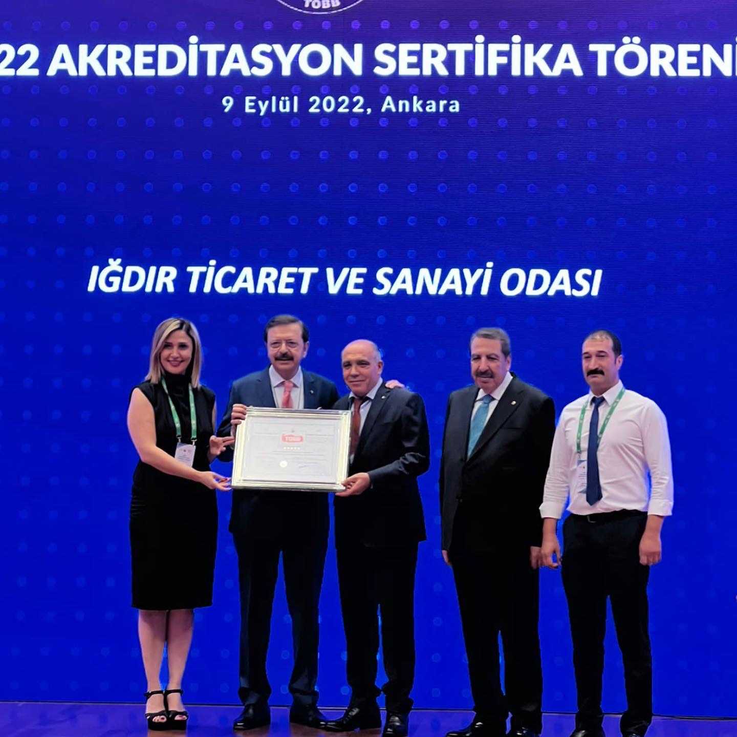Akreditasyon sistemi denetiminden başarıyla geçen odamız sertifikasını Türkiye Odalar ve Borsalar Birliği (TOBB) Konferans Salonu’nda gerçekleştirilen törenle, TOBB Başkanı M. Rifat Hisarcıklıoğlu’nun elinden Odamız yönetim kurulu başkanı Başkanı Kamil Arslan Akreditasyon izlene komitesi ve yönetim kurulu başkan yardımcısı Özcan Akkuş ve Genel Sekreter Gökçen Turan aldı