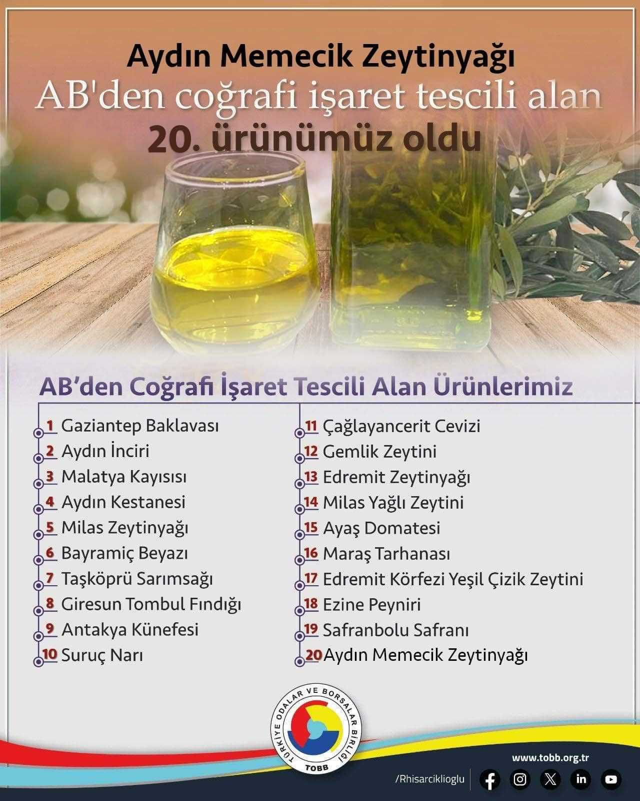 Aydın Memecik Zeytinyağı, AB’den coğrafi işaret tescili alan 20. ürünümüz oldu. Ülkemize hayırlı olsun. Aydın Ticaret Borsası Yönetim Kurulu Başkanı Fevzi Çondur’u ve emeği geçen herkesi kutluyoruz. Avrupa Birliği süreci devam eden 45 coğrafi işaret ve 5 geleneksel ürün adı ile ilgili Türkiye Odalar ve Borsalar Birliğimizin çalışmaları devam etmektedir.