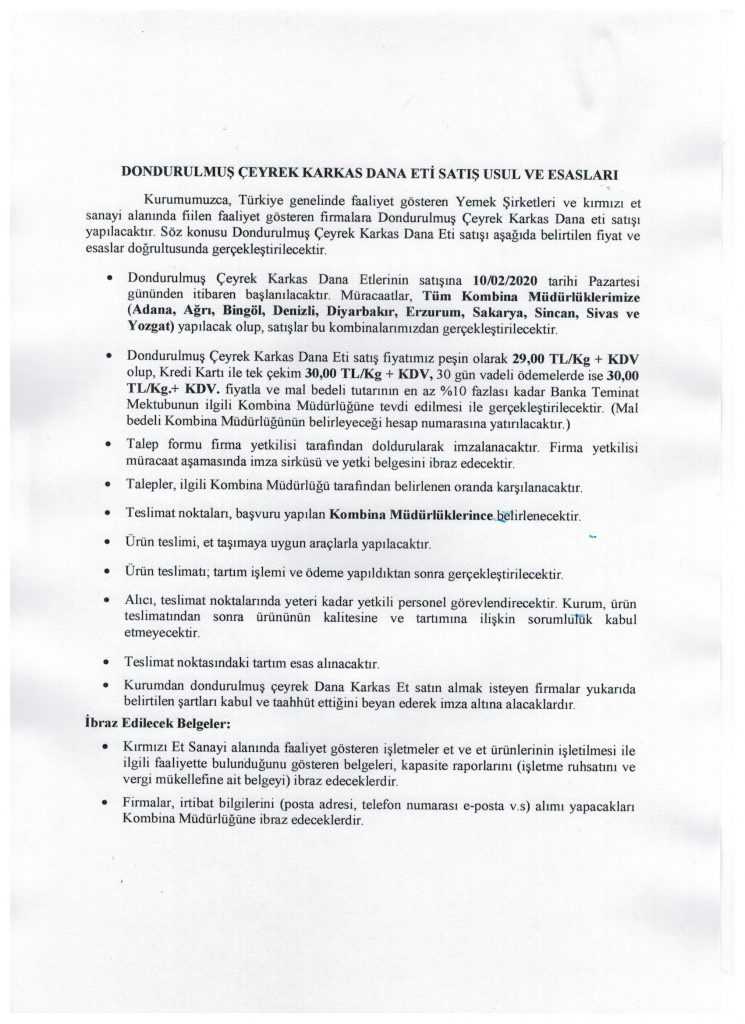 Kurumumuz stoklarında bulunan Dondurulmuş Sığır Karkas Etinin satışınabaşlanmıştır. Hinterlandınızda bulunan ve yazımız ekinde gönderilen satış usul ve esaslarınagöre alıcı olabilecek firmalara duyuru yapılması hususunda;Gereğinin yapılmasını arz ederim.