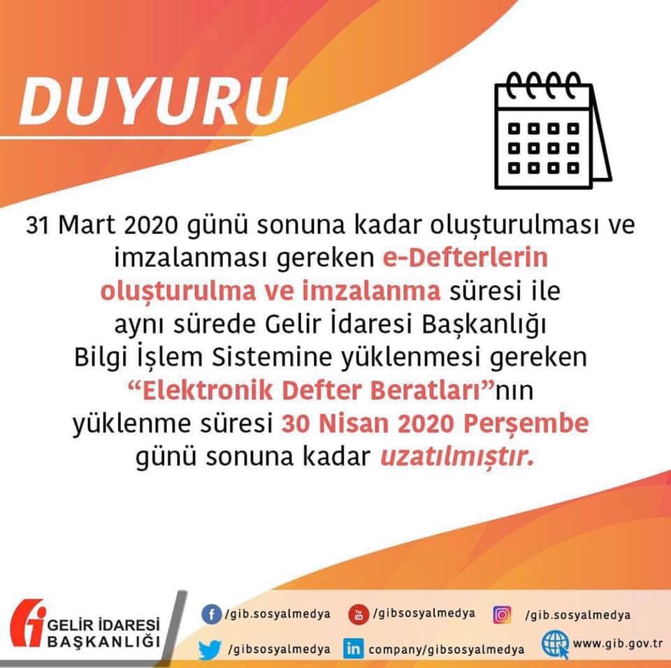 •E-defterlerin oluşturulma ve imzalanma süresi ve elektronik defter beratları 30 Nisan 2020 tarihine kadar ertelenmiştir.
