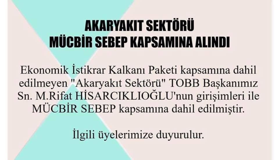 DevamıDetailsİlgili üyelerimize duyurulur..Akaryakıt sektörü mücbir sebep kapsamına alındı . @rhisarciklioglu @tobbiletisim