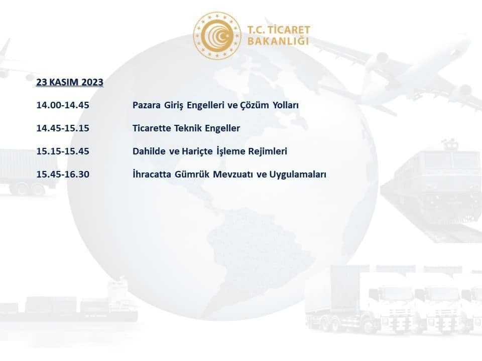 Ticaret Bakanlığı İhracat Süreçleri ve Yeni Nesil Devlet Destekleri Eğitim Programı 21-22-23 Kasım 2023Bakanlığımızca 21-22-23 Kasım 2023 tarihlerinde “Ticaret Bakanlığı İhracat Süreçleri ve Yeni Nesil Devlet Destekleri Eğitim Programı” görselde verilen program akışı kapsamında çevrimiçi olarak düzenlenecektir.Programa katılım ücretsiz olup kontenjan 1000 kişi ile sınırlıdır. Katılım sağlayabilmek için https://egitimbasvuru.ticaret.gov.tr/ adresindeki bilgilerin doğru ve eksiksiz bir şekilde doldurulması ayrıca aynı mail adresi ile farklı kişilerin başvuru yapmaması önem arz etmektedir. Mail adreslerinde sorun olması durumunda bağlantı linki katılımcılara iletilememektedir.Eğitim programının sonunda zoom üzerinden on sorudan oluşacak çoktan seçmeli bir sınav gerçekleştirilecek olup sınavda en az yüzde elli başarı gösteren katılımcılara dijital Başarı Belgesi gönderilecektir. Belgelerinin hatasız gönderilebilmesi adına, bağlantı linkine giriş yaparken istenilen bilgilerin doğruluğu önem arz etmektedir.Bir sonraki çevrimiçi eğitim 5-6-7 Aralık 2023 tarihlerinde gerçekleşecektir.