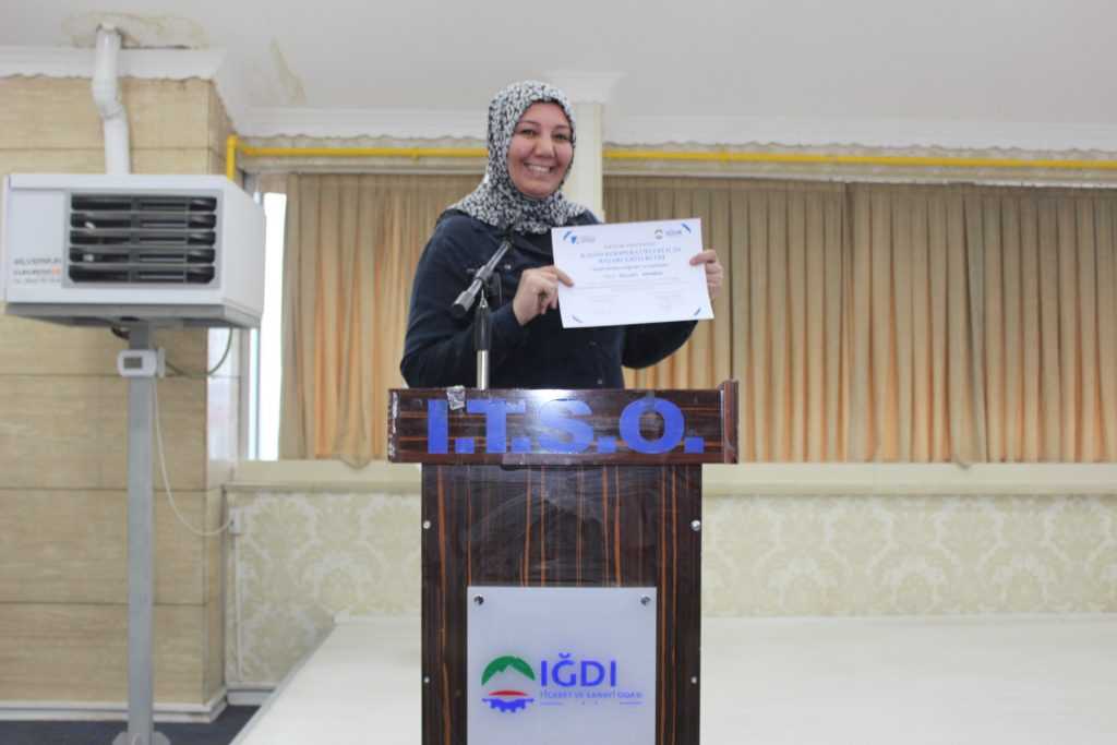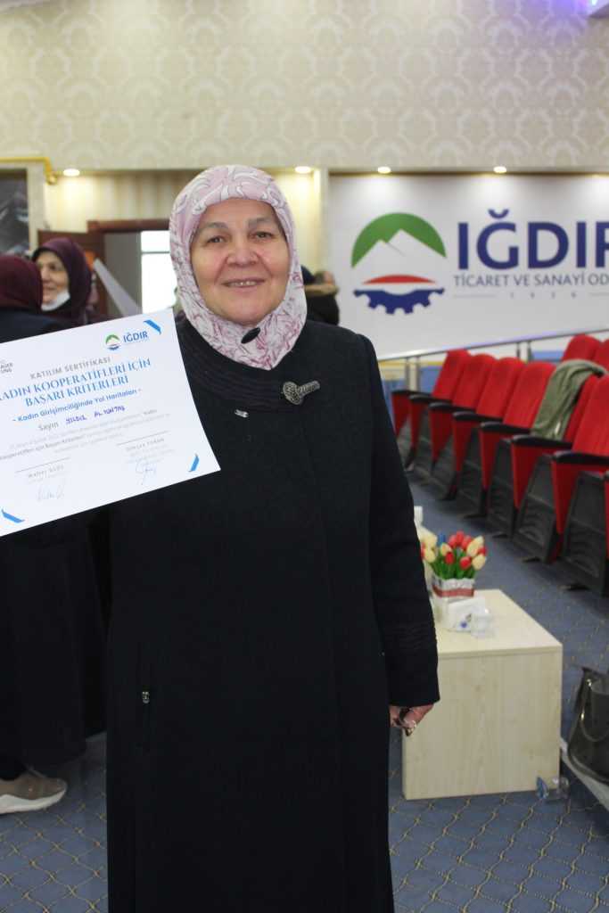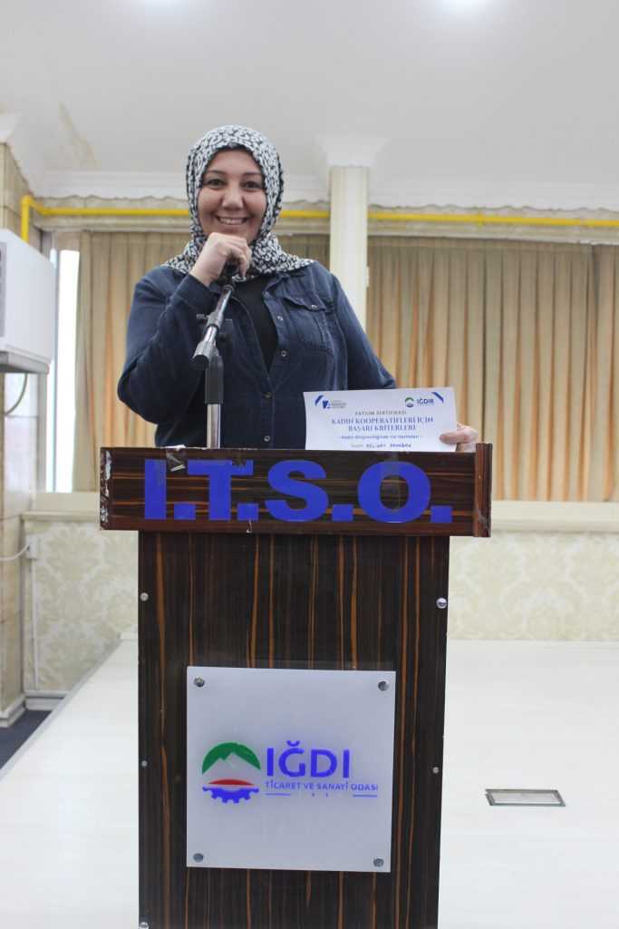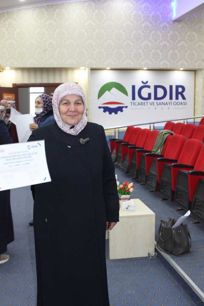 5 gün süren Eğitim sonrası Iğdır Ticaret ve Sanayi Odası Genel Sekreteri Gökçen Turan,Iğdır Ticaret Borsası Genel sekreteri Sibel Güneş , Kadın kooperatifleri ve Girişimci kadınların katılımları ile Iğdır Ticaret ve Sanayi Odası Konferans Salonunda sertifika töreni gerçekleştirildi. 55 kadının sertifika aldığı dağıtım töreninde açıklama yapan Odamız genel sekreteri Gökçen Turan “Kadının iş gücüne katılımı, ekonomik ve sosyal yaşamın sürdürülebilirliği açısından bir gerekliliktir. Cesaretiyle, azmiyle her alanda kendine yer bulan kadınlarımız hem aile hayatımızda hem de iş hayatımızda en önemli yere sahiptirler. Kooperatifler insanların bir araya gelerek sosyal ekonomik ve kültürel amaçlarına demokratik karar verme yoluyla ulaşmalarını sağlayan bir girişim modelidir.İlimizde yeni kurulan ve kurulacak olan Kadın kooperatiflerimizle paylaşmanın dayanışmanın yardımlaşmanın güçlü sermaye karşısında Disiplin ve sorumluluk odaklı çalışmaları, kadınlarımızı bir adım daha öteye götürerek iş hayatında kendilerini kanıtlamış ve birçok başarıya imza atacaklardı.. Her alanda kendilerini geliştiren ülkemiz ekonomisine katkıda bulunan tüm kadın girişimcilerimizin yolu açık olsun. Verdiğimiz eğitimler sayesinde Iğdır’da kendi işini kuran kadınların sayısının her geçen gün arttığını söyleyen Turan “Bu durum bizleri sevindirmektedir. Her zaman kadın girişimcilerimizin yanlarında yer alarak Iğdır Ticaret ve Sanayi Odası olarak desteklerimizi sürdürmekteyiz” dedi.