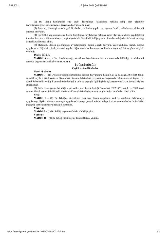 Sayın Üyemiz,Yiyecek ve içecek hizmeti faaliyetlerinde bulunan işletmeler için Ciro Kaybı Destek Programı Resmi Gazete’de yayımlandı.Detaylar: https://resmigazete.gov.tr/eskiler/2021/02/20210217-7.htm