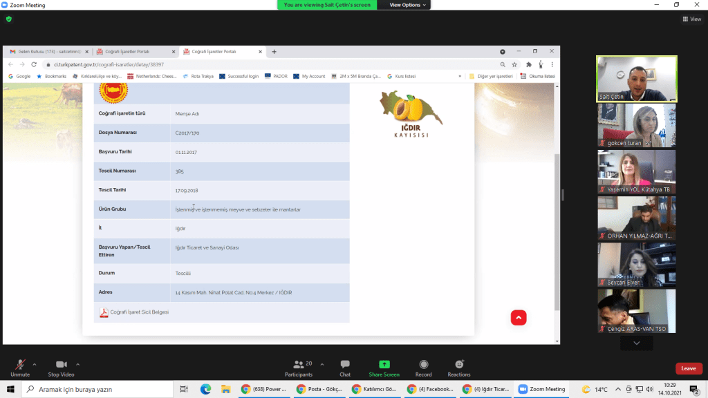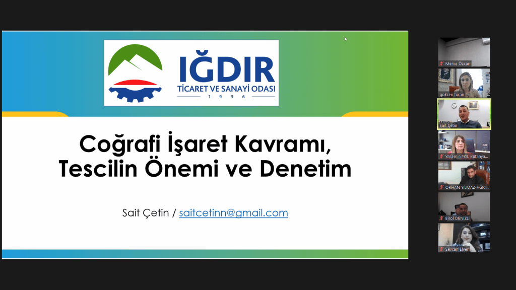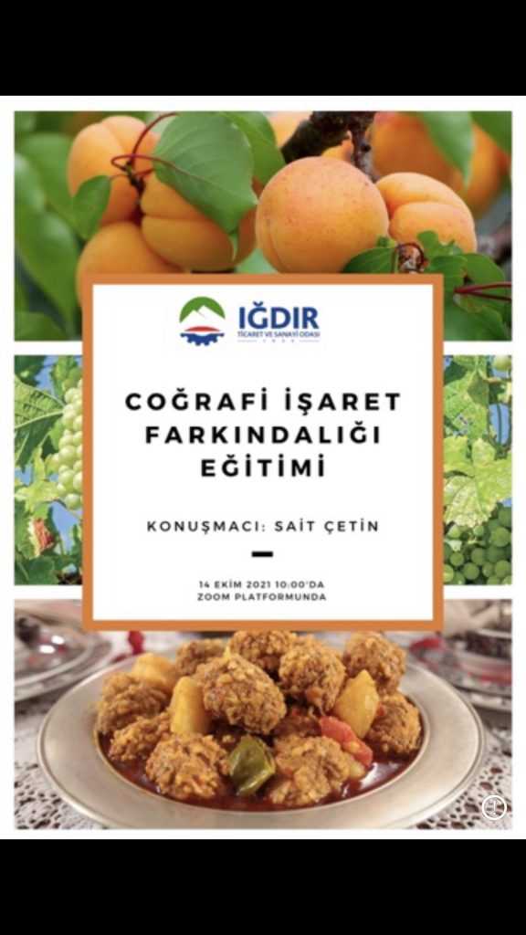 Iğdır Ticaret ve Sanayi Odası organizasyonunda gerçekleştirilen “Coğrafi İşaret Farkındalığı ”konulu eğitim 14.10.2021 tarihinde gerçekleştirilmiştir. Verilen eğitimin konu başlıkları şunlar olmuştur.