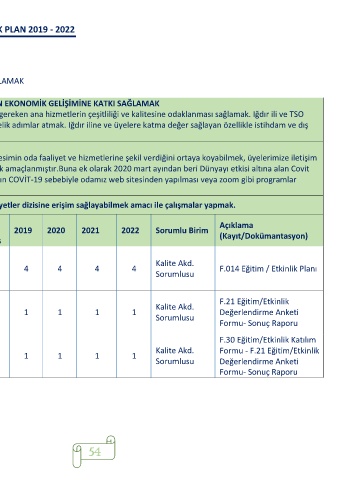 KYS Stratejik Faaliyetler Performans Hedef 2019 2020 2021 2022 Sorumlu Birim Açıklama
