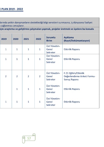 KYS Stratejik Faaliyetler Performans 4 yıllık Hedef 2019 2020 2021 2022 Sorumlu Açıklama