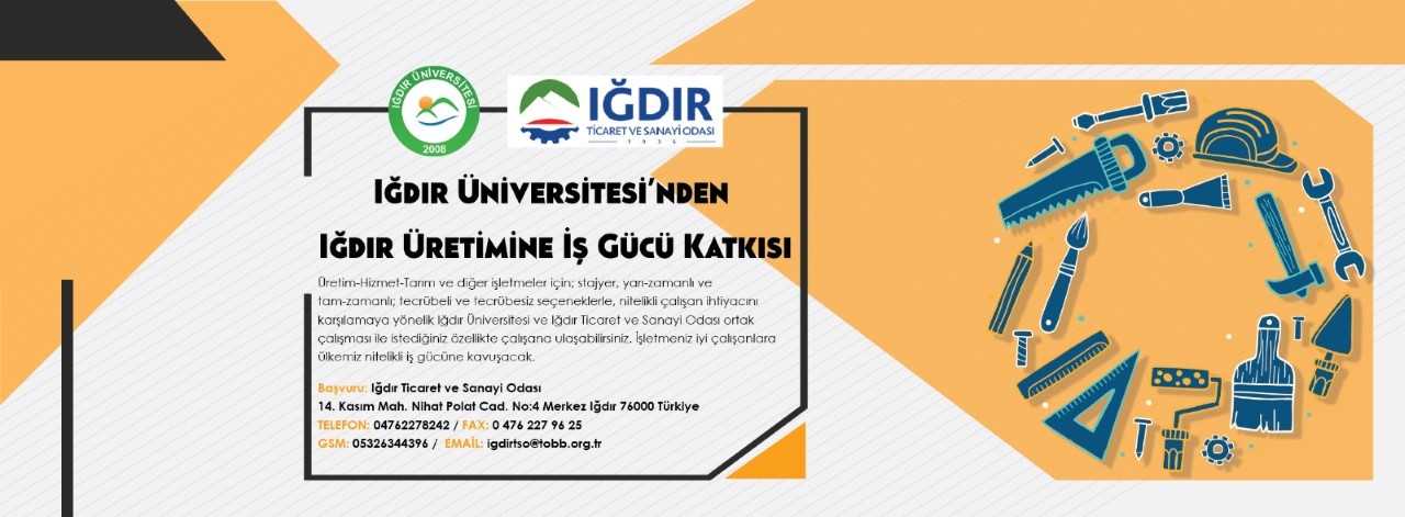 İşletmenizde staj, yarı-zamanlı çalışan ya da tam zamanlı çalışan ihtiyacınızı en yüksek nitelikte karşılamak amacıyla Iğdır Üniversitesi-Iğdır Ticaret ve Sanayi Odası işbirliğiyle yürütülen çalışmadan yararlanabilirsiniz. İhtiyacınız olan çalışan sayısını, niteliğini ve özelliklerini belirterek, aşağıdaki verilen iletişim kanalına iletmeniz yeterlidir. Azer hanım 0476 227 82 42-11