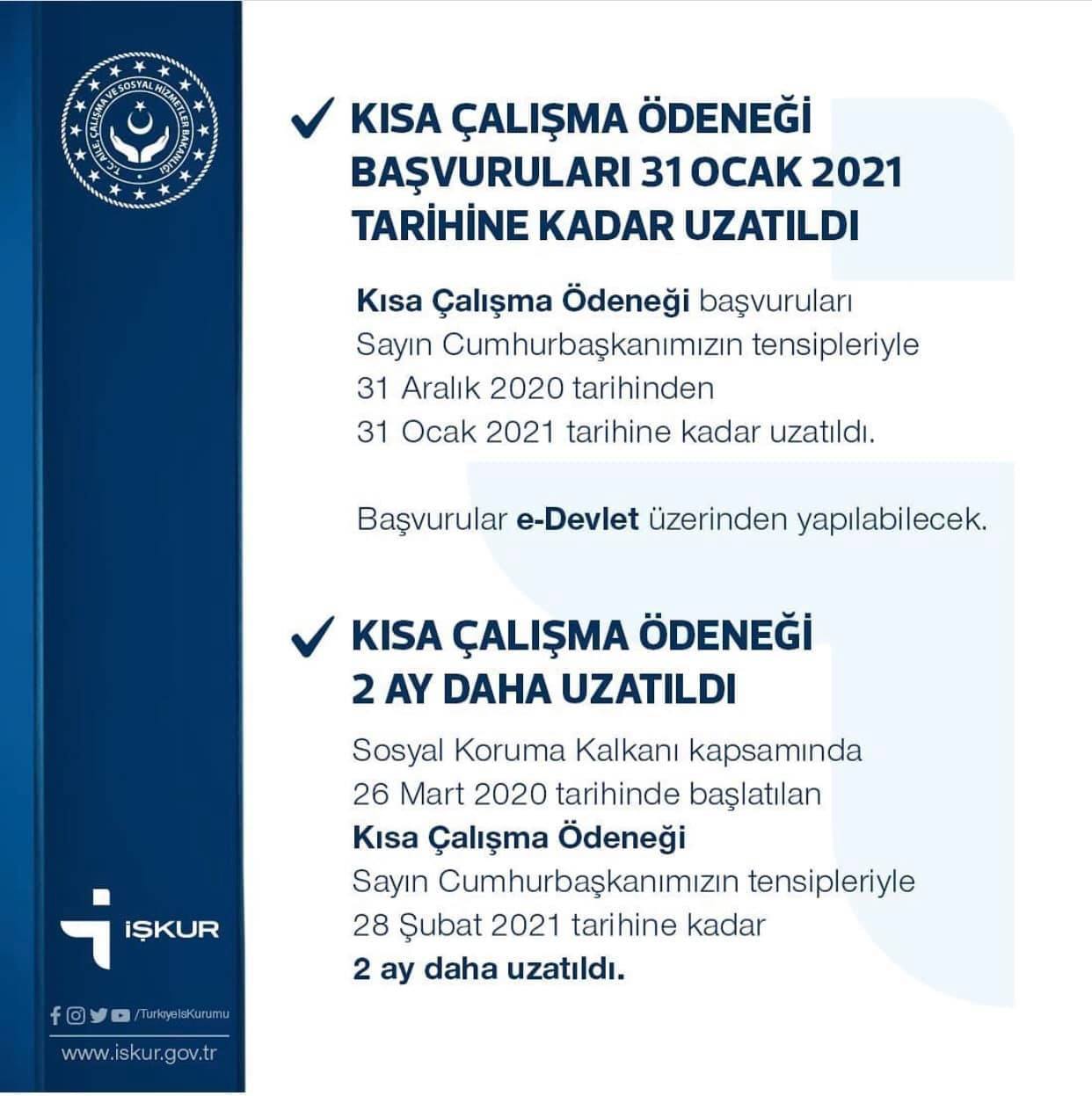 Resmi Gazete’de yayımlanan Cumhurbaşkanı kararları ile kısa çalışma süresi 28 Şubat 2021 tarihine kadar uzatıldı.• 30 Haziran 2020 tarihinden sonra kısa çalışma müracaatı yapamayan üyelerimiz için başvuru süresi 31 Ocak 2021’e kadar uzatıldı.