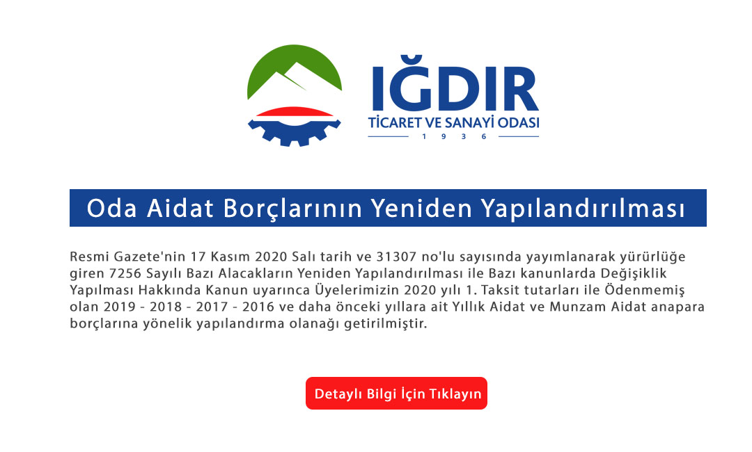 Resmi Gazete’nin 17 Kasım 2020 Salı tarih ve 31307 no’lu sayısında yayımlanarak yürürlüğe giren 7256 Sayılı Bazı Alacakların Yeniden Yapılandırılması ile Bazı kanunlarda Değişiklik Yapılması Hakkında Kanun uyarınca Üyelerimizin 2020 yılı 1. Taksit tutarları ile Ödenmemiş olan 2019 – 2018 – 2017 – 2016 ve daha önceki yıllara ait Yıllık Aidat ve Munzam Aidat anapara borçlarına yönelik yapılandırma olanağı getirilmiştir.
