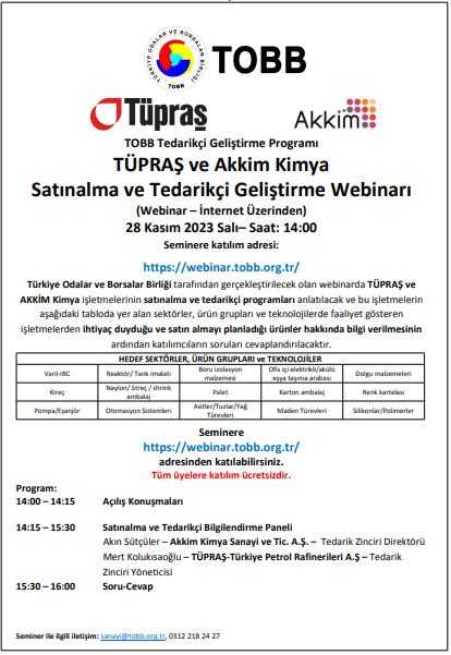 internet üzerinden 28 Kasım 2023 Salı günü saat 14:00’te TOBB Tedarikçi Geliştirme Programı kapsamında
