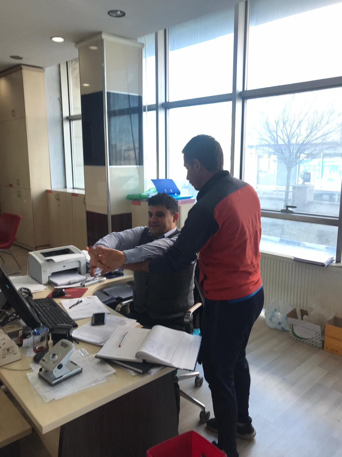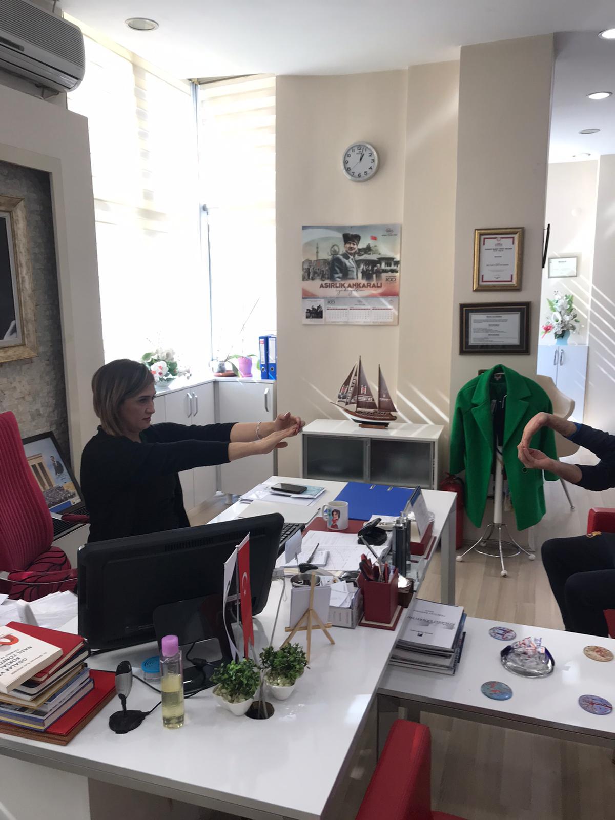 3289 sayılı, Spor Genel Müdürlüğü Teşkilat ve Görevleri ile ilgili kanunun, kuruluş amacına uygun olarak Gençlik spor müdürlüğü Boks antrenörü Burhan Özen ,Atletizm antrenörü Mustafa Taşkıran Tarafından odamızda çalışan Personellere Masa başında çalışan kamu personellerinin hareketsiz bir yaşam sürdüğü göz önünde bulundurularak oturdukları yerde yapabilecekleri egzersizleri göstermek amacıyla çalışan personelleri spora teşvik etmek ve bilinçlendirmek amacıyla yapılacak olan çalışmalara destek vermek amacıyla masa başı eksersizleri yaptırıldı.