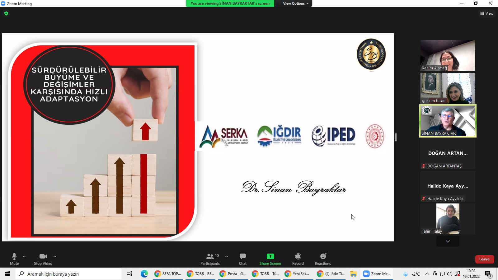 Iğdır Ticaret ve Sanayi Odası tarafınca talep edilen “Sürdürülebilir Büyüme ve Değişimler Karşısında Hızlı Adaptasyon” 19.01.2022 tarihinde Sinan BAYRAKTAR tarafından verilmiştir. Odamız Meclis başkanı Tahir Talay’ın başkanlığında online yapılan eğitime tüm personelimiz ve üyelerimiz katılım göstermiştir. Eğitimin içeriği aşağıda şekildedir: