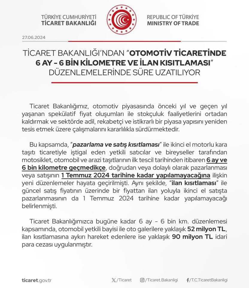 T.C. Ticaret Bakanlığı’ndan “Otomotiv Ticaretinde 6 Ay – 6 Bin Kilometre ve İlan Kısıtlaması” Düzenlemelerinde Süre Uzatılıyor