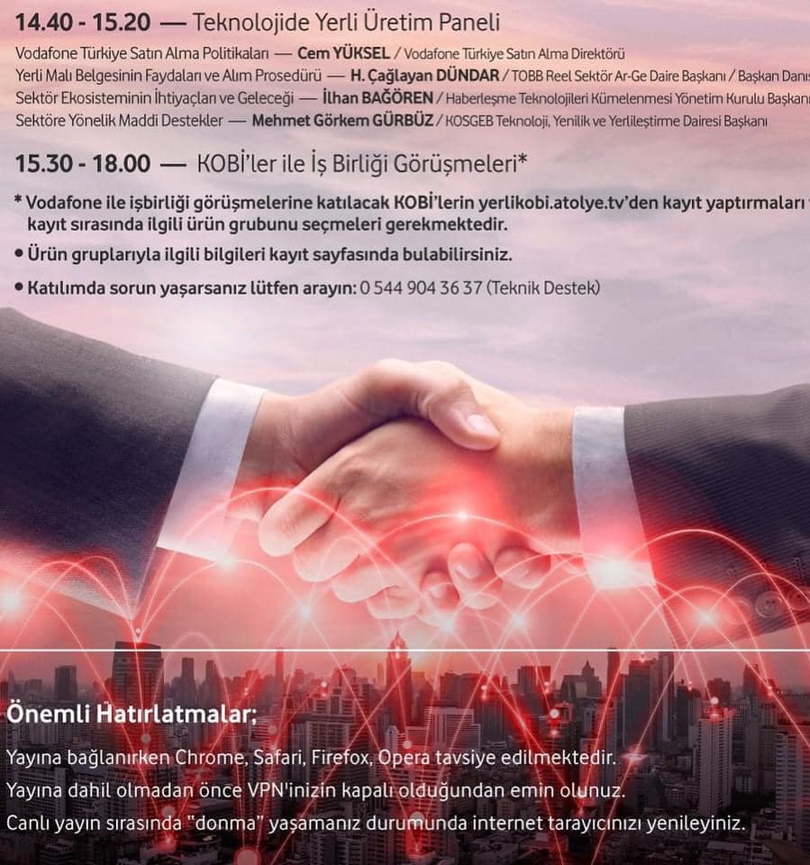 TOBB ve Vodafone işbirliğinde 20 Ocak 2021 Çarşamba saat 14:00’ta gerçekleştirilecek olan “Teknolojide Yerli Üretim ve KOBİ’lerin Gücü Webinarı ve B2B Etkinliği”ne katılımınızı bekliyoruz. Detaylar: https://webinar.tobb.org.tr Kayıt: https://yerlikobi.atolye.tv @vodafoneTR