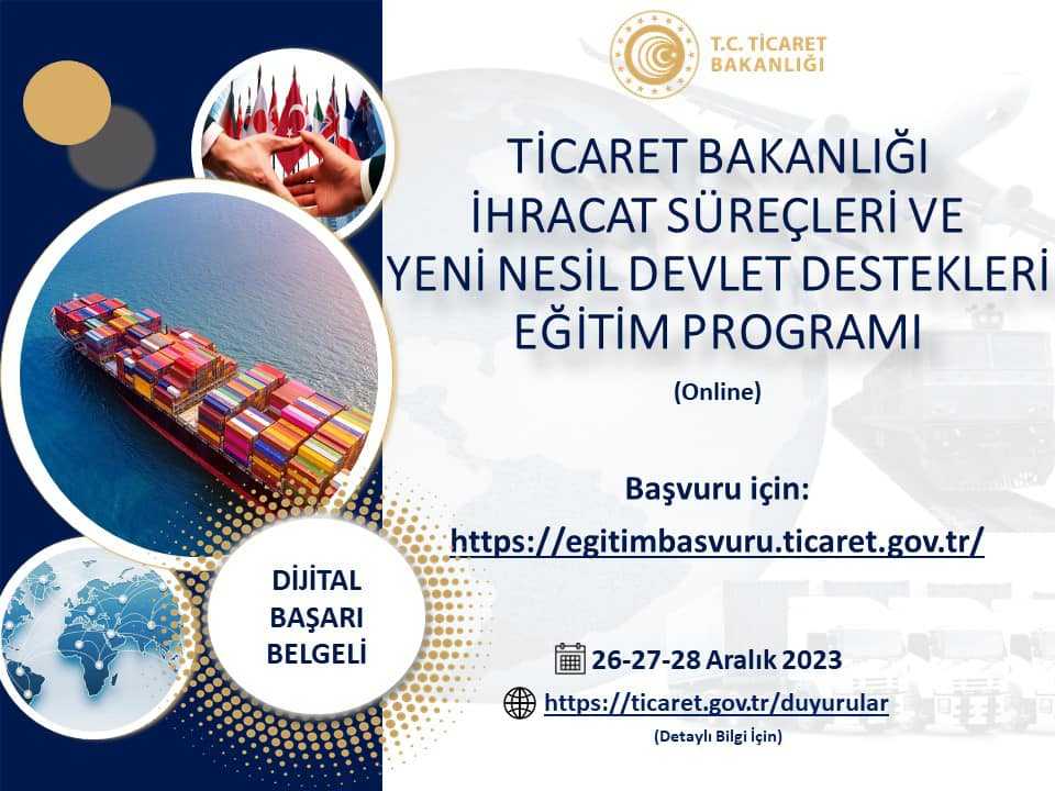 Bakanlığımızca 26-27-28 Aralık 2023 tarihlerinde “Ticaret Bakanlığı İhracat Süreçleri ve Yeni Nesil Devlet Destekleri Eğitim Programı” görselde verilen program akışı kapsamında çevrimiçi olarak düzenlenecektir.Başvuru için: https://egitimbasvuru.ticaret.gov.tr/ Detaylı bilgi ve dijital Başarı Belgesi alma koşulları için: https://bit.ly/egitimhakkinda