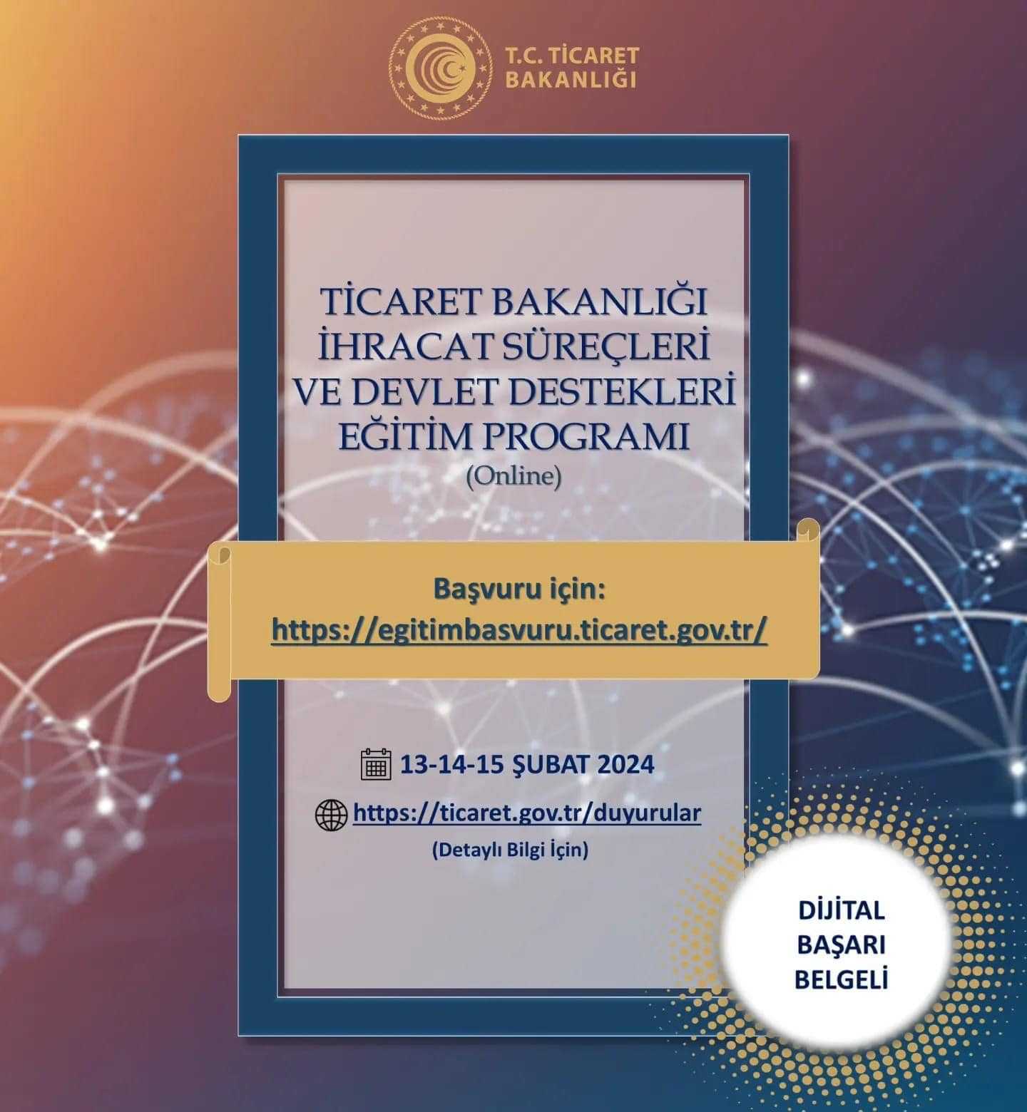 Ticaret Bakanlığı İhracat Süreçleri ve Yeni Nesil Devlet Destekleri Eğitim ProgramıKayıt Linki: egitimbasvuru.ticaret.gov.tr