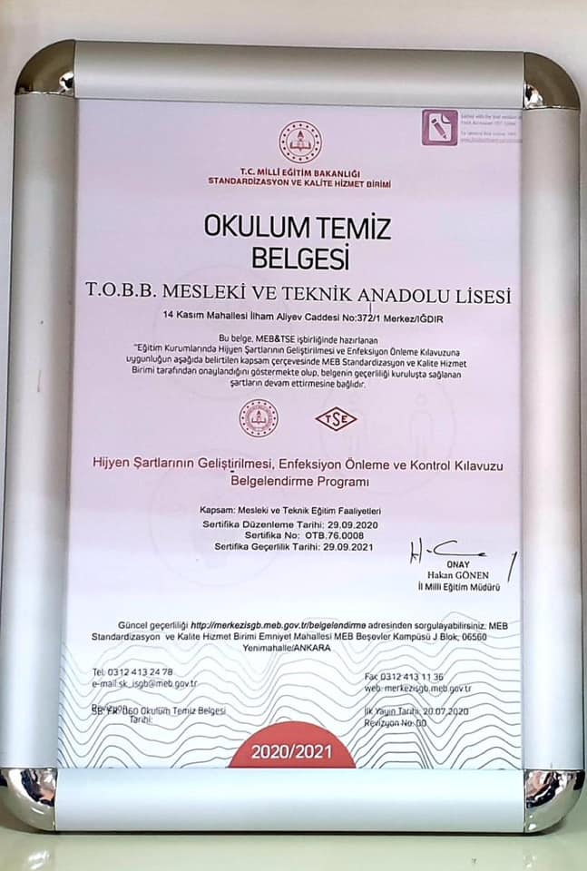 TOBB MESLEKİ VE TEKNİK LİSESİ GURURLANDIRDI.Okulumuzun yoğun ve titiz çalışmalar neticesinde “Beyaz Bayrak” ve “Beslenme Dostu Okul Sertifikası”ndan sonra “Okulum Temiz Belgesi” almaya hak kazanmıştır. Bu başarıların elde edilmesinde emeği geçen Okul Müdürümüz ve çalışanlarına teşekkür eder başarılar diliyoruz.