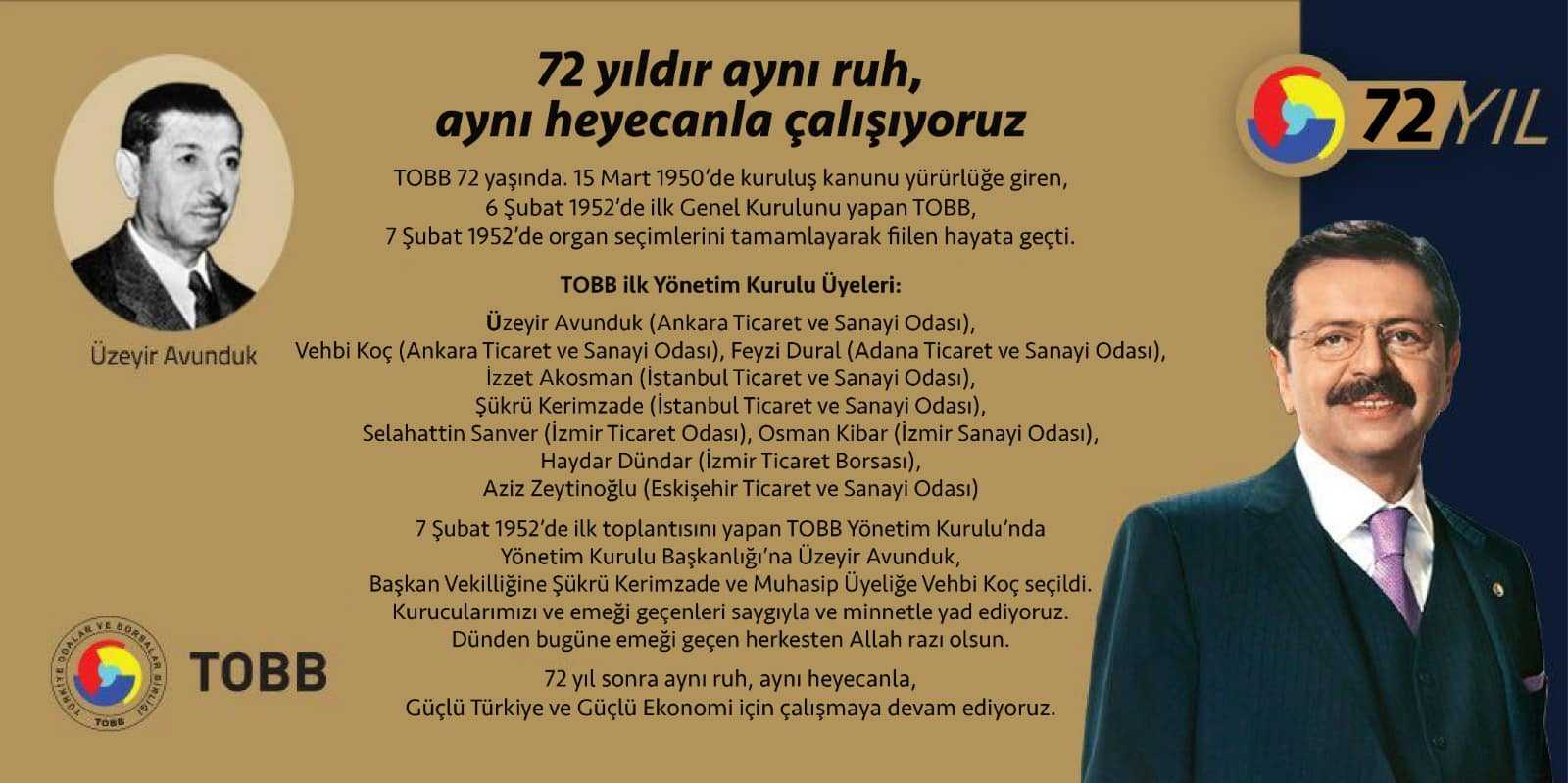 Türkiye Odalar ve Borsalar Birliği (TOBB) 72 yaşında.Kurucularımızı ve emeği geçenleri saygı ve minnetle yad ediyoruz.72 yıl sonra aynı ruh, aynı heyecanla, Güçlü Türkiye ve Güçlü Ekonomi için çalışmaya devam ediyoruz.