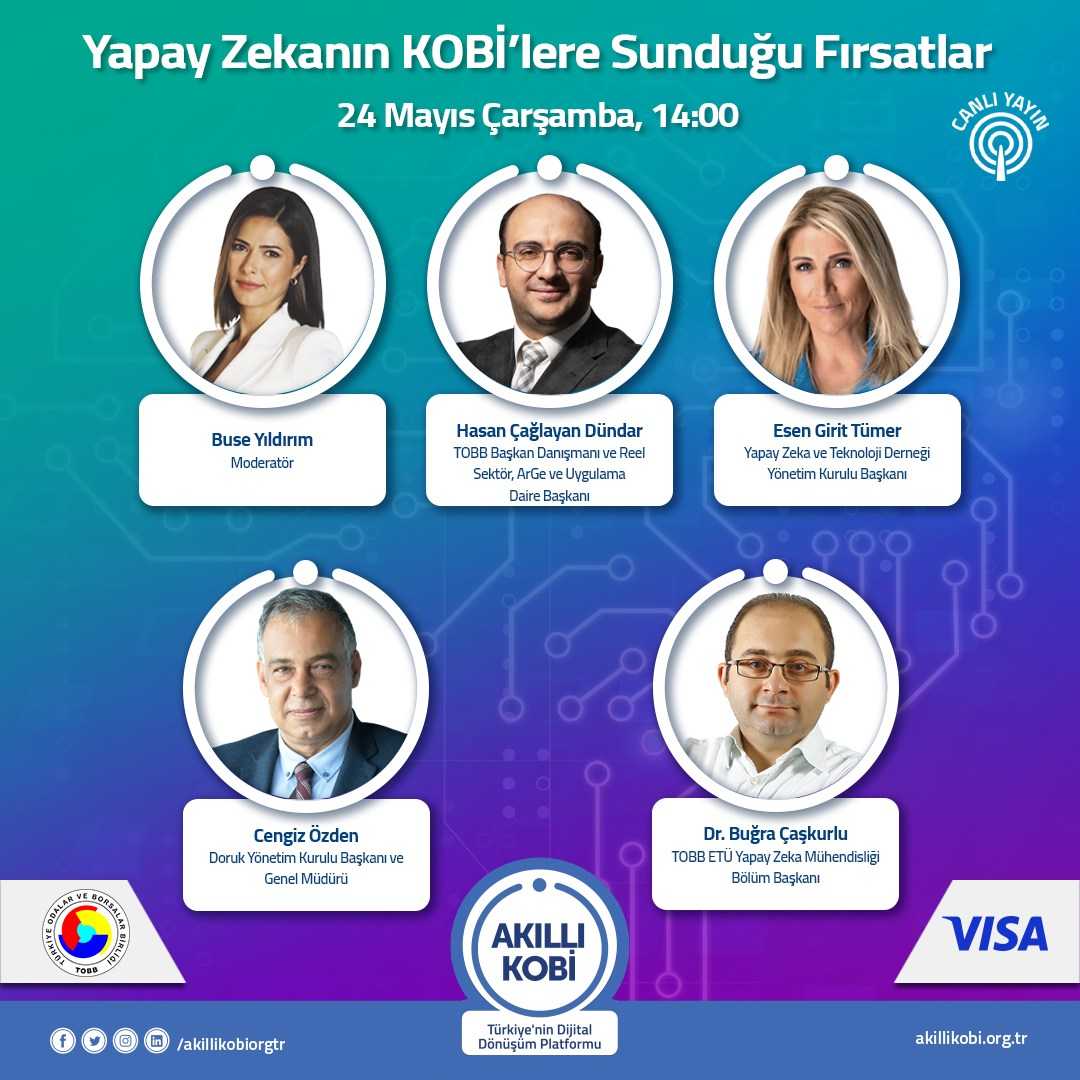 Türkiye’nin Dijital Dönüşüm Platformu Akıllı KOBİ çerçevesinde 24 Mayıs 2023 Çarşamba 14:00’te gerçekleştirilecek “Yapay Zekanın KOBİ’lere Sunduğu Fırsatlar Canlı Yayını”na katılımınızı bekliyoruz.