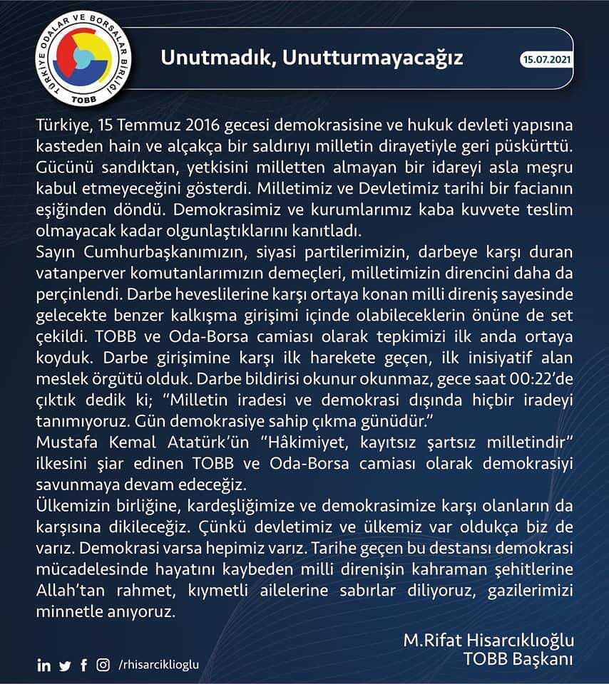 15Temmuz’da darbe bildirisi okunduğunda harekete geçen İLK MESLEK ÖRGÜTÜ olarak “Milletin iradesi ve demokrasi dışında hiçbir iradeyi tanımıyoruz. Gün demokrasiye sahip çıkma günüdür” dedik…