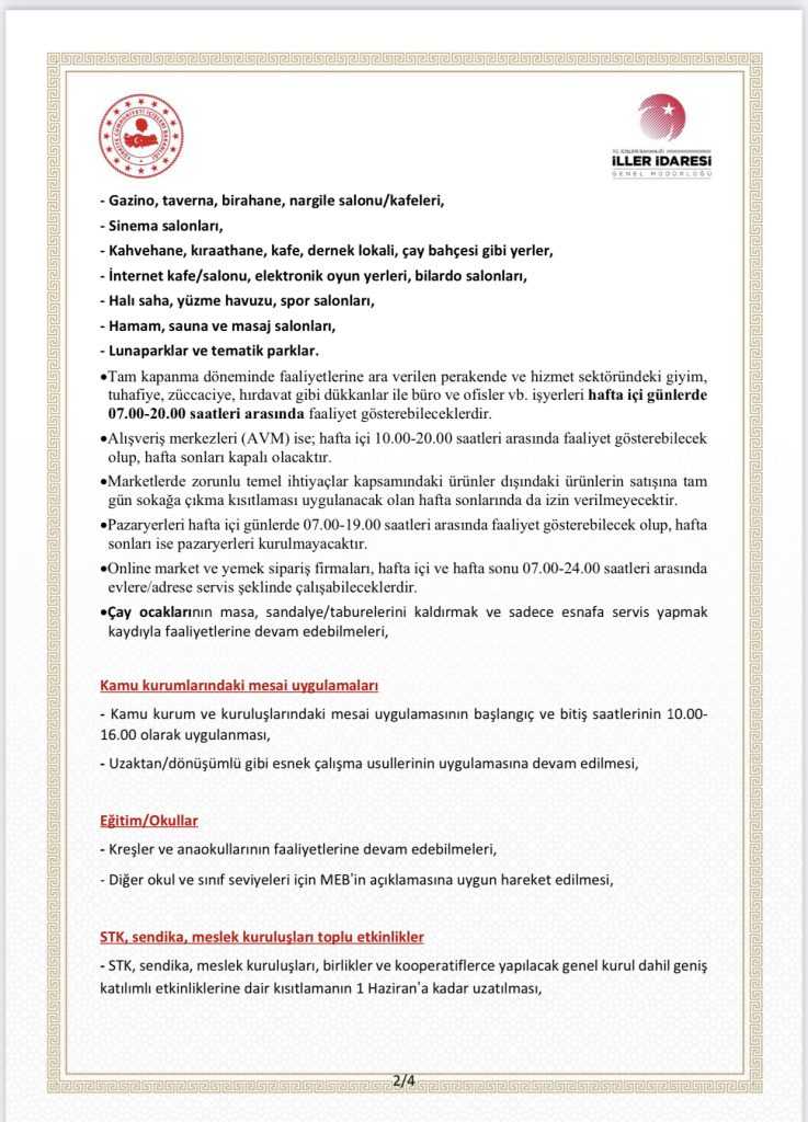 2 Mayıs Pazar Günü 24:00′ a kadar kısıtlamadan muaf olan işletmeler mevcut izin belgeleriyle işlem yapabileceklerdir.