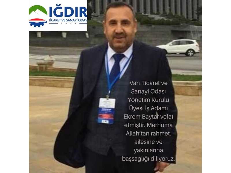 Van Ticaret ve Sanayi Odası Yönetim Kurulu Üyesi İş Adamı Ekrem Baytar vefat etmiştir. Merhuma Allah’tan rahmet, ailesine ve yakınlarına başsağlığı diliyoruz.IĞDIR TICARET VE SANAYI ODASI