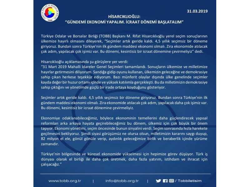 TOBB Başkanı M. Rifat Hisarcıklıoğlu, “Zira ekonomide atılacak çok adım yapılacak çok iş var. Hükümetimiz seçim öncesinde bunun sinyalini verdi. Seçimler geride kaldığına göre artık hızla harekete geçilmesini bekliyoruz” diye konuştu.