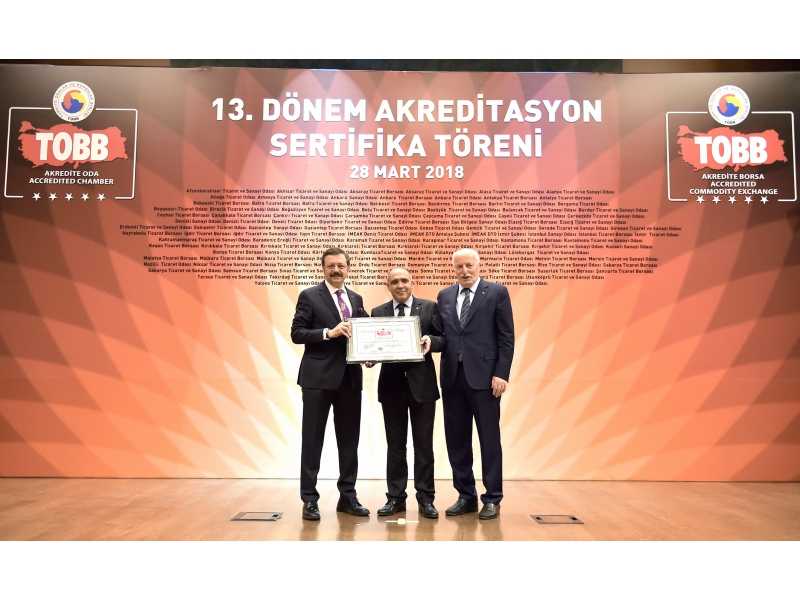 96 oda ve borsanın akreditasyon belgelerini yenilediği, 18 oda ve borsanın ilk kez akredite olduğu 13.dönem akreditasyon sertifika töreni, Gümrük ve Ticaret Bakanı Bülent Tüfenkci ve TOBB Başkanı M. Rifat Hisarcıklıoğlu’nun katılımlarıyla TOBB Konferans salonunda gerçekleşti. Törene ITSO Yönetim Kurulu Başkanı Kamil Arslan katıldı.
