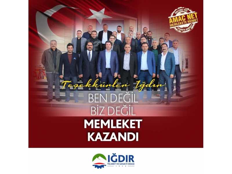 Seçimler süresinde değerli vakitlerini ayırarak büyük katılımla bu demokrasi mücadelesinde katkıda bulunan üyelerimize ,sonsuz teşekkürlerimi sunuyorum.Hepsi sorumlu birer üye olduklarını Iğdır ticaret ve sanayi odasının arkasındaki büyük güç olduklarını kanıtlamışlardır.