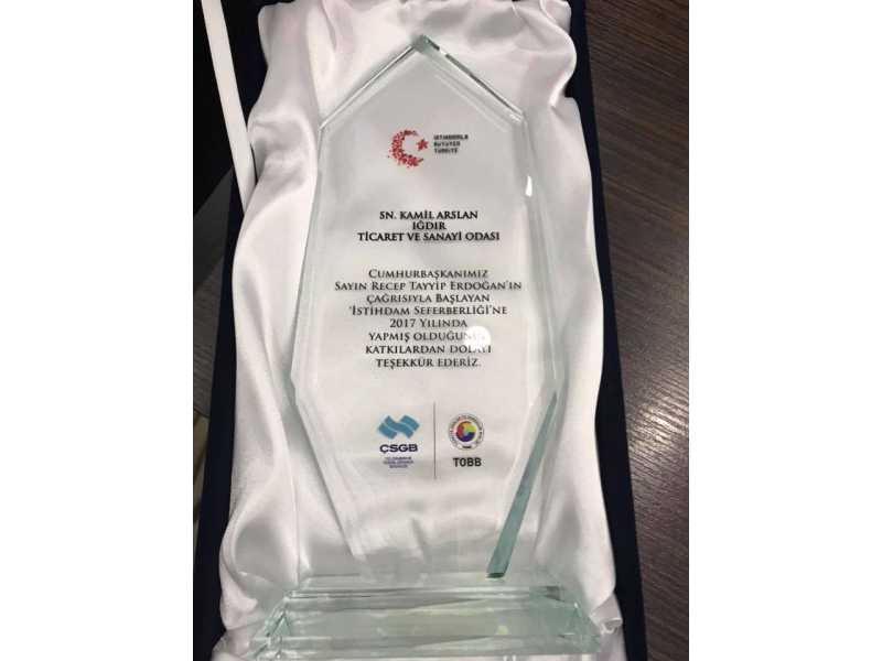 İstihdam Seferberliği Ödül Törenine, Türkiye’nin dört bir tarafından Cumhurbaşkanlığı Külliyesi’ne gelen 2000 kişi civarında Oda-Borsa üyesi ve iş dünyası temsilcisi katıldı. Iğdır Ticaret ve Sanayi Odası Yönetim Kurulu Başkanı Kamil Arslan Meclis Başkanı Oğuz Nefis Yönetim Kurulu Başkan yardımcıları Efgan Aydın ,Tahir Talay ,Genel Kurul Delegesi Kıyas Baştimur ve Genel Sekreter Gökçen Turan ‘dan oluşan ITSO Heyeti katılım sağladı.