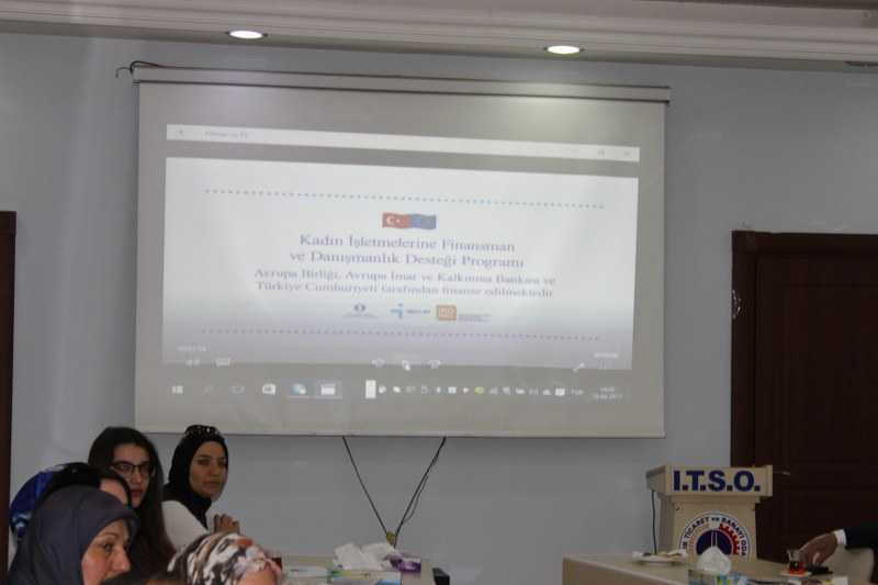 Odamız Genel sekreteri Gökçen Turan ve Kadın girişimcilerinin önderliğinde kadın işletmelerine Finansman ve Danışmanlık desteği programını içeren seminer odamız meclis toplantı salonunda verildi.TEB banka Müdürümüz Erhan Ayhan ve İş bankası Yetkililerinin katıldığı toplantıda kadın girişimciler programla ilgili detaylı bilgiyi Kıdemli Kadın Girişimciliği Uzmanı Belgin Güzaltan tarafından verildi.Programla ilgili açıklama yapan başkan Kamil Arslan ;