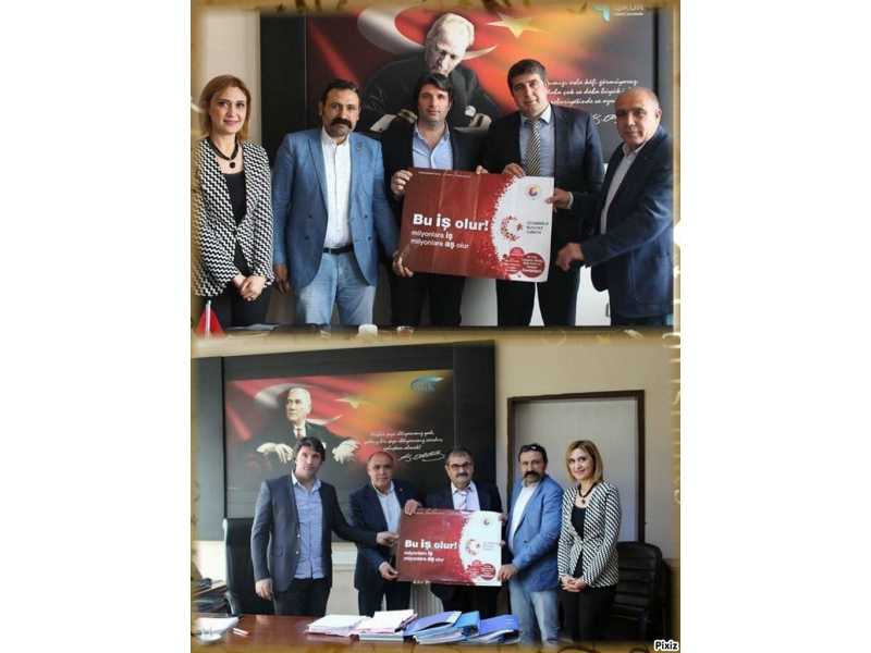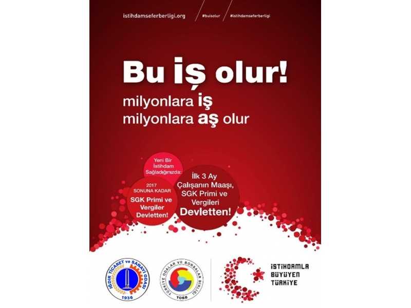 Sayın Cumhurbaşkanımızın teşrifleriyle 07/02/2017 tarihinde gerçekleştirilen TOBB Türkiye Ekonomi Şurası'nda Birliğimiz ve Çalışma Sosyal Güvenlik Bakanlığı ile yürütülmekte olan istihdam seferberliği projesi kapsamında bizzat Cumhurbaşkanımız tarafından ülke genelinde istihdamı artırmaya yönelik çalışma başlatılmış ve teşvikler açıklanmıştır. Bu bağlamda TOBB tarafından hazırlanan afişleri odamız yönetim kurulu başkanı Kamil Arslan,Yönetim kurulu Başkan yardımcıları Tahir Talay ,Efgan Aydın ve Genel sekreter Gökçen Turan tarafından İşkur Müdürümüz Abdullah Can ve SGK müdürümüz Emin Öztürk 'e yapılan hayırlı olsun ziyaretinde takdim edildi.Başkan Kamil Arslan Milli istihdam seferberliği kapsamında yapacağımız çalışmalarda bu afişlerin kullanılması TOBB'un bu projeye verdiği desteği bir kez daha göstermiştir.Milli istihdam seferberliğinde Iğdır için biz oda olarak her platformda bu işin takipçisi olacağız. dedi.
