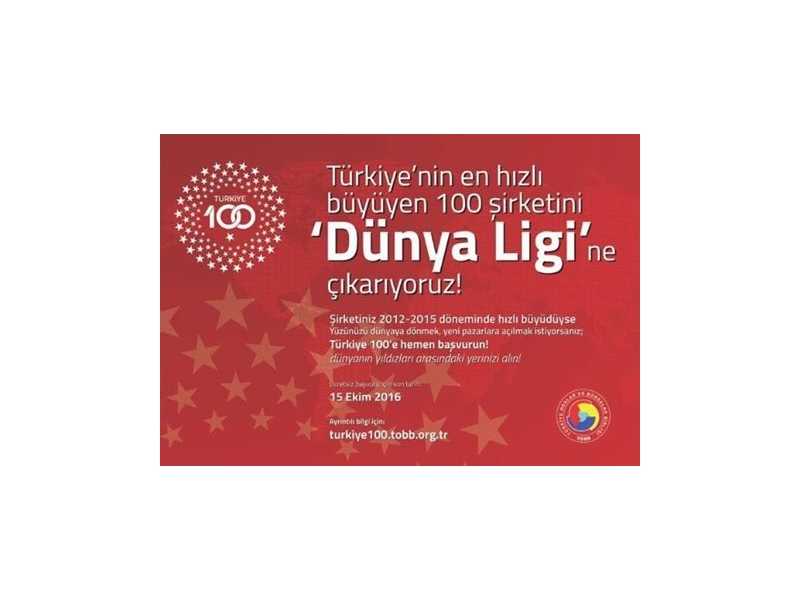 Türkiye Odalar ve Borsalar Birliği’nden alınan yazıda; Türkiye Odalar ve Borsalar Birliği öncülüğünde, ABD merkezli AllWorld Network ve Türkiye Ekonomi Politikaları Araştırma Vakfı (TEPAV) işbirliğinde, Türkiye’nin en hızlı büyüyen şirketlerinin belirlenerek, söz konusu şirketlerin görünürlüklerini artırmak ve bu şirketlerin küresel bağlantılarını kuvvetlendirmek amacıyla 2011 yılından beri “Türkiye’nin En Hızlı Büyüyen 100 Şirketi – Türkiye 100” projesi yürütüldüğü bildirilmiştir.