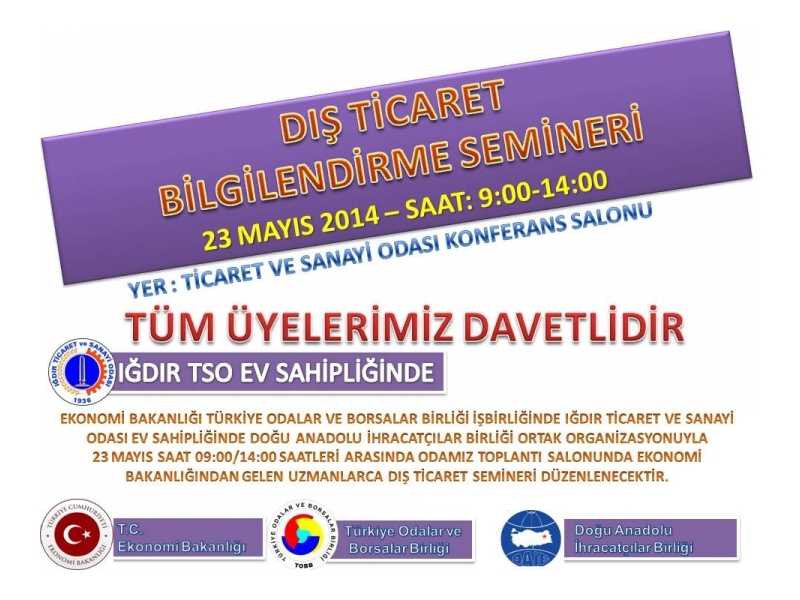 Dış Ticaret Bilgilendirme Semineri Düzenlendi. Tarih; 2016.05.25 Ekonomi Bakanlığı Koordinatörlüğünde,Türkiye Odalar ve Borsalar Birliği işbirliğinde Odamız ve Doğu Anadolu İhracatçılar...