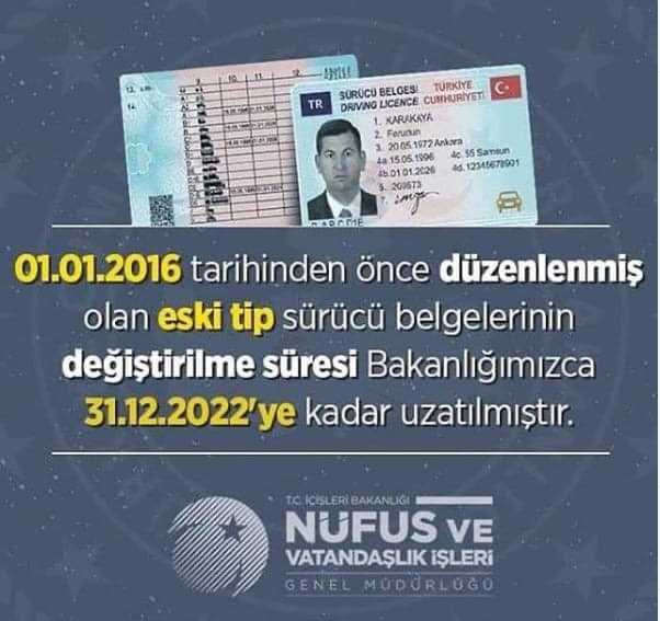 01.01.2016 tarihinden önce düzenlenmiş olan eski tip sürücü belgelerinin değiştirilme süresi Bakanlığımızca 31.12.2022’ye kadar uzatılmıştır.